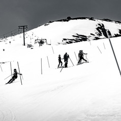 Spännande konturer och former i fjällen på kvällningen. De blytungt hängande molnen och den vita snön skapar framträdande kontraster i naturen. Lugnet och avsaknaden av både byglar och människor gör att skidanläggningen känns annorlunda. Mer avskalad.